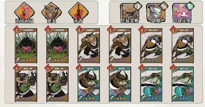 狮子承担团队防御增益和护甲覆盖的职责,装备组合为饮血四件套+踏风逐云,后者专门用来为少年角色叠加护甲,神话效果需要接近200%;前缀优先级为铁衣>养元。武学配置固定为土系八张(包含2张十面埋伏、2张灵猴棍法、2张破天刀法、2张弹指一刹)与风系四张(2张烈风斩、2张独行刀法)。古器要选赤阳珠、沧澜链、魍面,这三者都能为少年角色提供攻击力加成,不可替换。