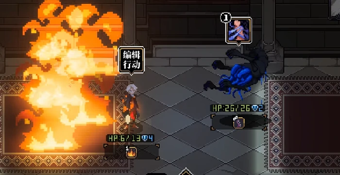 第一次点燃地毯后,火焰会扩散开来,把怪物唤醒;进入战斗阶段后,角色每回合会受到固定的火焰伤害,但怪物因为怕火,根本没法近身,这就形成了安全的输出窗口。这时候可以稳定释放低消耗魔法牌,进行远程压制。