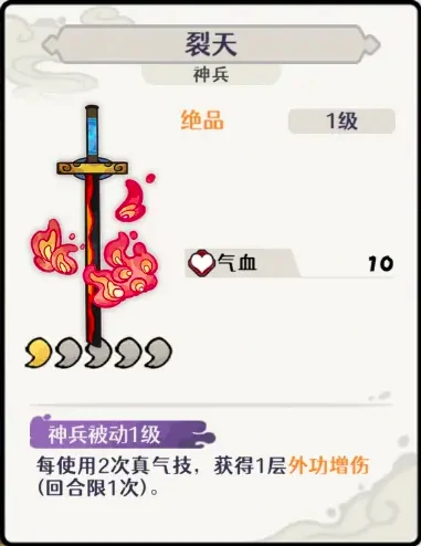 专属神兵裂天能给它带来稳定的成长收益:每成功释放两次真气技能,就能叠加1层外功增伤buff,而且这个增益每回合最多触发一次,机制稳定,收益也一目了然。它的天赋还附带额外铜钱产出,能多拿100到200铜钱,但得通关宝钱庄历练副本才能解锁,这个副本难度不高,刚好适合中期攒资源的时候去打。