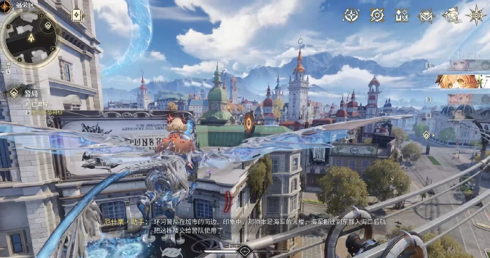 接下来就正式开启白银之城警局任务了。因为警局位置比较偏远,建议直接开启任务的自动指引功能。路上可以召唤坐骑来加快移动速度,还要善用场景里的空气旋流装置腾空——借着这个能直接越过地形障碍,大大节省赶路时间。而且升空状态下还能操控马匹平稳前进,顺便还能顺手捡沿途的宝箱和补给道具。