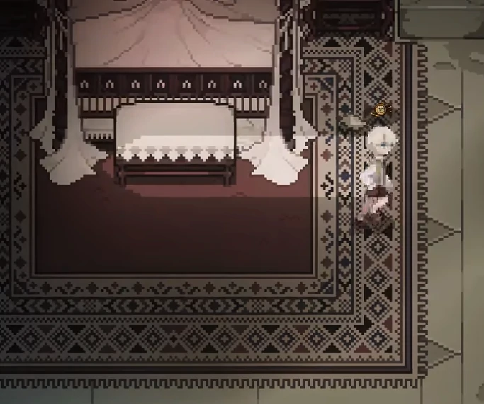 此处存在一条未明示的隐藏路径:若在点燃地毯前先行调查油画并进入其中密室,即可解锁专属支线剧情。回归主线后,前往母亲房间触发事件,随即发现父母双双消失。紧接着执行第三次判定,成功后场景重载,画面出现明显晃动,象征主角精神状态剧烈波动。前方地面可拾取父母遗留信件,同时幸运值再次提升。随后调查油画,激活机关,开启密道入口。