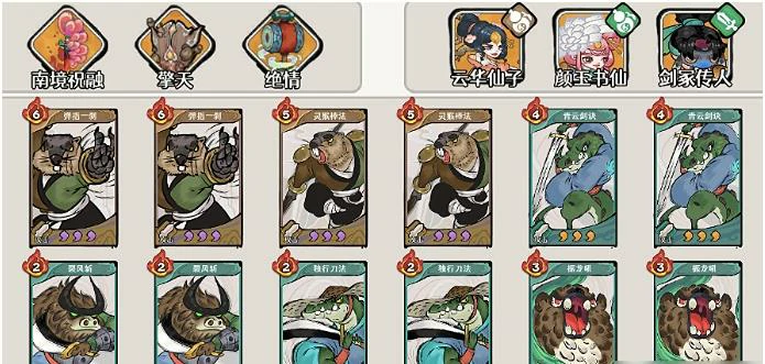 队伍搭配上,推荐采用云华仙子+颜玉书仙+剑冢传人的组合:双悬壶职业能保证续航的稳定性,剑客则提供爆发输出和技能联动的核心支点。卡组构建建议携带弹指一刹×2、灵犀棒法×2、青云剑诀×2、烈风斩×2、独行刀法×2、镇龙吼×2,确保怒气转化、过牌效率和终结能力三者保持均衡。神兵选择上,擎天是必选,用来锁定核心武器栏位,避免鬼抽影响节奏;备选可以选南境祝融和绝情,如果还没获取到,也能用同类型的风伤加成或怒气返还类神兵替代,没有强制绑定的要求。具体的配装逻辑已经在上图中标注说明。