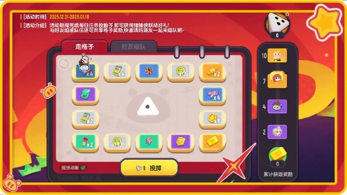 活动核心玩法为掷骰前行——玩家每日完成指定任务就能获取骰子投掷次数。每次掷骰后,角色会沿路径前进对应步数,所落到的格子即为本次奖励的归属。地图格子设计差异化明显,涵盖资源类、道具类、限定外观类等多种类型,不同步数将触发不同的收益组合。