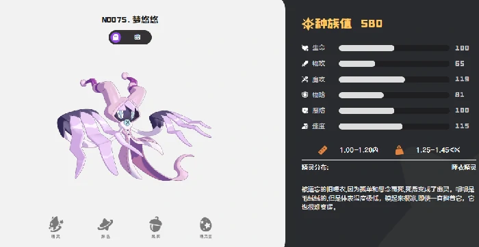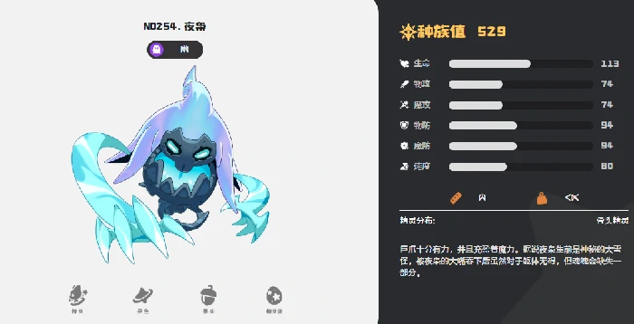 第三位精灵选夜枭异色,幽灵属性,它有个独特的入场增益机制:只要敌方使用了聚能类技能或者切换精灵,它登场后就能立刻获得20%的魔攻提升,还会自动释放灵光这个高倍率单体魔法伤害技能。其余技能推荐搭配易燃物质(给目标附加持续灼烧效果)、倾斜(中等威力的魔攻技能,命中后能降低敌方魔防)、防御(提升自身生存的稳定性)。