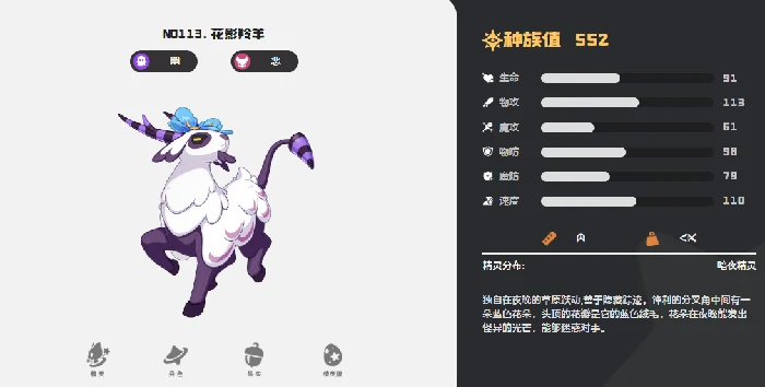 第六位收尾精灵选奇丽花异色,植物属性,它的核心价值在于能量恢复和长效增益,被动效果是:每回合行动结束后,自动恢复2点能量。技能配置推荐光能聚集(造成魔法伤害,每次命中后这个技能的基础威力会永久+10%,可以无限叠加)、丰饶(提升自身物攻和魔攻各1级)、纤维化(提供高额减伤,同时提升自身物防2级)、岩脉崩毁(高倍率的单体物理伤害技能)。