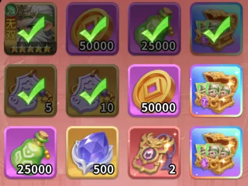 铜雀台是单向挑战的爬塔玩法,每天的挑战次数没有上限,但已经通关的层数无法重复挑战。奖励是按照当天达到的最高层数来发放的,而且不支持自动领取——一定要在每天0点重置后手动领取前一天的通关奖励,别错过资源。这个玩法更看重阶段性的突破,适合集中资源冲击新的层数,不用反复刷已经通过的关卡。