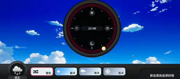 点击这个按钮后,界面顶部会显示一个24小时制的模拟表盘,用来调节游戏内的时间;表盘下方就是天气控制区域。这里默认开启“随机天气”模式,但也支持手动指定为晴天、雨天或雪天三种类型——这是当前内测版本的全部可选选项,后续更新或许会增加更多气象种类。