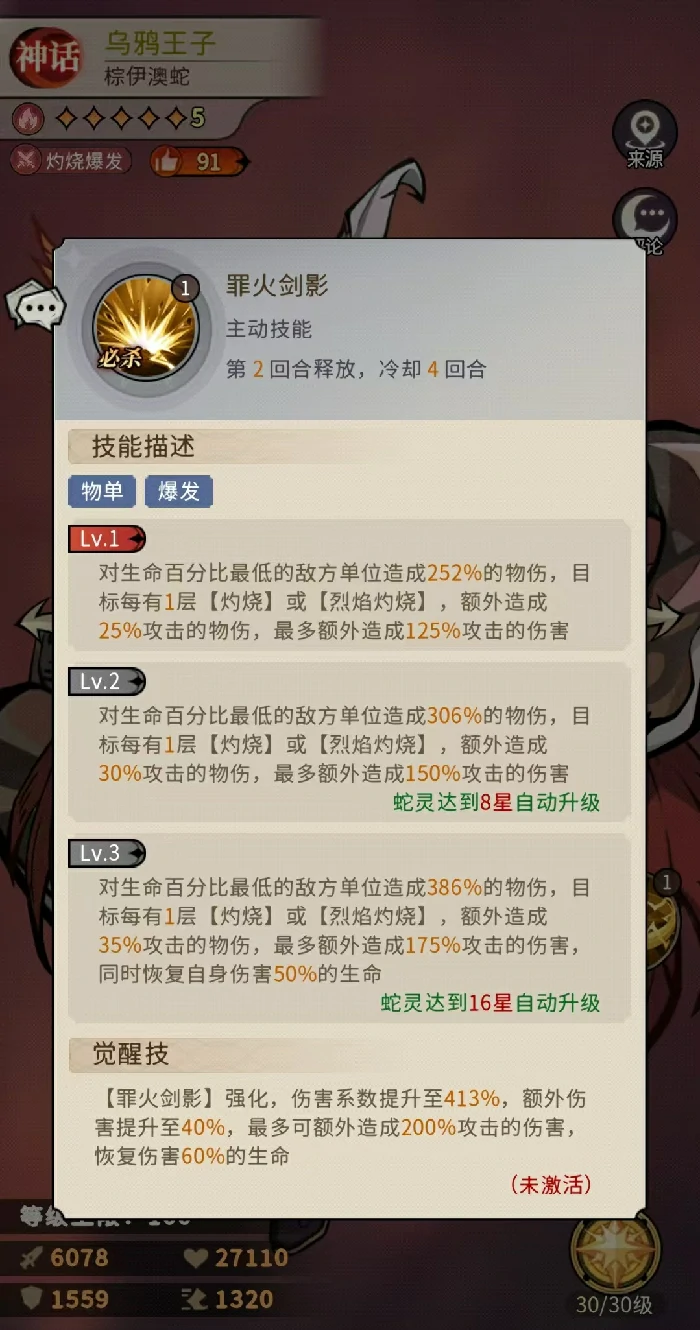 乌鸦王子的一技能带有双触发机制:能对敌方前排到中排单位造成基础物理伤害,还有概率给目标挂上灼烧状态;如果目标当前血量低于50%,这个技能的暴击伤害还会额外提升。等技能升级后,面对已经挂了灼烧或烈焰灼烧的目标,以及血量过半的单位,还能额外追加伤害。被挂上灼烧的目标,每回合会损失相当于乌鸦王子15%攻击力的血量,这个效果最多能叠加5层。