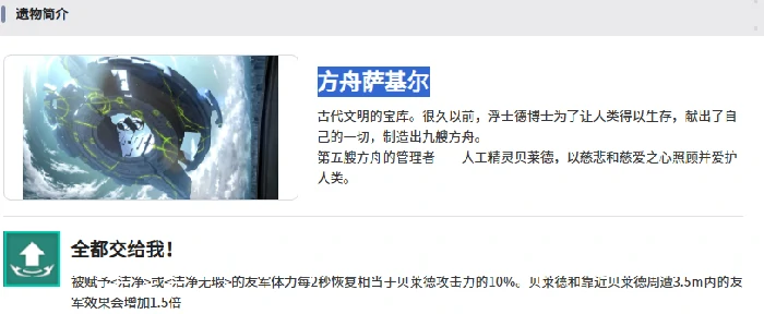 贝莱德的专属遗物方舟萨基尔,附带技能全都交给我,使用后可以为队友赋予洁净或洁净无瑕状态,带有这些状态的队友每2秒就能获得一次相当于贝莱德攻击力10%的体力回复。