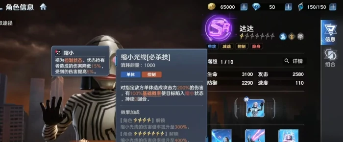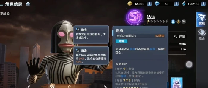 实战中,达达展现出了极强的单体压制能力。作为SR角色,他的群体清场能力确实偏弱,但高星级解锁的眼部光线附带的眩晕判定,在当前游戏底层机制里依旧拥有较高的打断优先级。尤其是在释放隐身技能后,达达能迅速进入无法被选中的安全状态,同时自动积攒瞄准效果。这种侧重生存容错与爆发衔接的设计,要求格斗家在追求高输出的同时,精准把控隐身状态下的反击窗口。