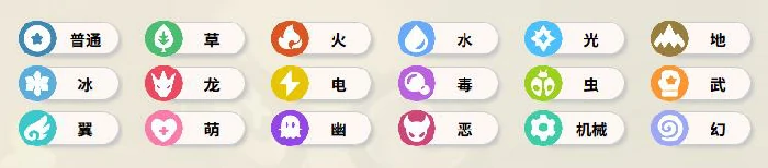 当前版本一共开放了16类属性标签,既包含火/水/草/冰/电/毒/地面/岩石/飞行/龙/恶/钢这些经典元素属性,也有机械/翼/幽/萌/光这类原创属性。单属性精灵遵循基础克制逻辑:火系对草、冰、虫、机械有2倍伤害压制;水系克制火、地面、岩石、机械;草系对水、地面、岩石、恶有2倍伤害;冰系克制草、龙、地面、飞行;龙系仅克制龙系;恶系克制幽系;光系和幽系互为克制;机械系会被火、冰、电、幽克制,不过能抵抗草、恶、光的攻击;翼系怕电、冰、岩石属性,却能抵抗虫、草、机械的攻击。所有克制系数严格按照官方设定来,没有主观调整。