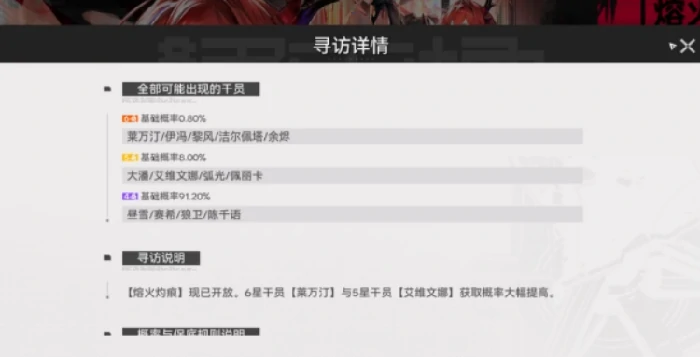 熔火灼痕属于限时限定寻访,想要参与这个卡池,得先推进主线到指定节点,完成几项基础关卡后,系统就会自动解锁寻访入口。抽卡有两种方式可选:用专属寻访凭证,或者消耗通用游戏货币。专属寻访凭证主要靠活动任务获取,建议优先用掉这类凭证,把通用货币留着应付其他刚需支出。和常驻池相比,这个卡池的核心机制是定向概率提升——部分目标星级干员,特别是六星干员,实际出卡概率比常规池要高,官方没公布具体数值,但不少玩家都反映,想要抽的目标角色出卡效率确实高了不少。另外这个卡池有独立的保底计数体系,保底进度和其他寻访池不互通,能让大家把资源集中起来,更快锁定想要的干员。
