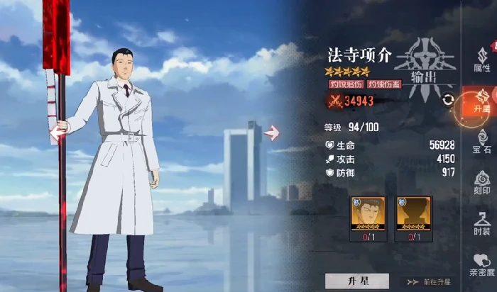 第二个推荐的是法寺项介,定位建议放在副输出位。他的核心优势是能持续给敌人施加灼烧状态,配合技能模组还能快速完成多次追击,对周边敌人的持续压制力拉满。随着回合推进,灼烧层数不断叠加,后期伤害会逐步攀升,能大幅提升燃烧体系队伍的整体战力。作为五星输出角色,他的培养成本不算高,是组建燃烧队时必练的核心成员之一。