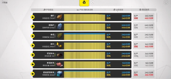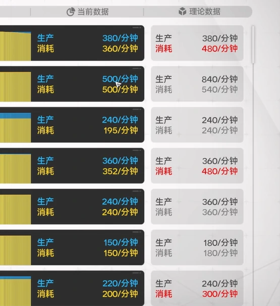 还有一种情况是理论消耗数据高于当前消耗,这说明使用该材料的下游产线没跑满功率。要么是下游产线数量不足,要么是下游产线本身缺其他材料卡住了,这就是可以优化的点,顺着这条线索去排查就能找到问题所在。