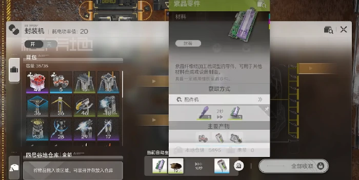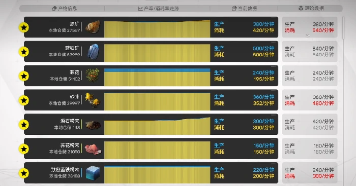刚开工时你可能会看到生产、消耗数据全是0,别着急,这不是故障,只是数据更新有延迟。等一会儿理论数据就会显示为6,和之前的计算逻辑一致。但此时当前数据可能只有3,这是怎么回事呢?答案很简单——材料供给不足。低熔电池的合成配方是5个紫金零件加10个原始粉末,换算下来紫金零件和原始粉末的消耗比例是1:2。如果只铺设了一条原始粉末产线,材料供给必然跟不上,产线会因缺料陷入停工状态,自然当前数据会远低于理论数据。