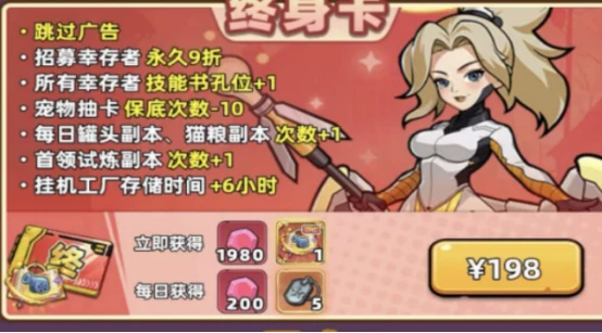 终身卡采用一次性付费模式,成功购买后就能解锁一系列永久增益效果,所有功能即时生效。比如游戏里烦人的广告总会打断游玩节奏,而终身卡提供的永久跳过广告功能,能让你彻底摆脱广告干扰,大幅提升游戏流畅度。另外在资源获取上也有实打实的优化,不少玩家招募角色往往要投入不少成本才能拿到心仪培养道具,入手终身卡后,就能享受永久招募9折福利,直接降低了角色获取的成本压力。
