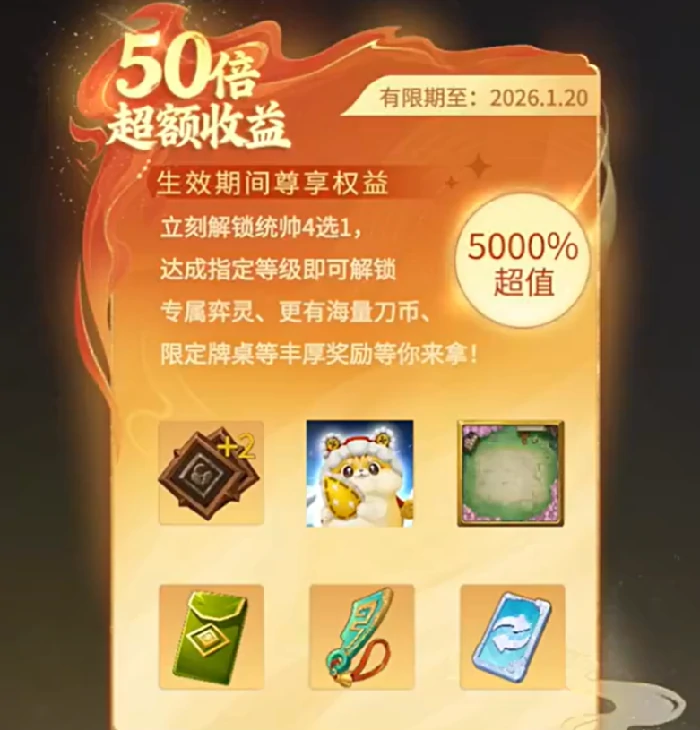 再往上就是68元的高级通行证。入手通行证后,将额外解锁一个统帅栏位,不管是排兵还是布阵,战术选择都会灵活不少。除此之外,还有专属棋盘、强力异灵以及各类资源道具,内容相当丰富。对于想快速提升战力的玩家来说,这个通行证实用性拉满。不过单买通行证并不是最优选择,如果能凑到200元以内的金额,就能享最高档返利,相当于花一份钱拿双份收益,性价比直接拉满。