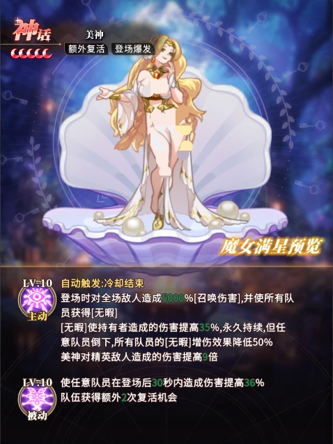 需要注意的是,低星级的美神,其无瑕状态存在血量阈值限制,这时要避免搭配高爆发的角色比如红龙,防止队友被快速击倒导致美神的增伤效果大打折扣。美神的获取途径主要是卡池抽取和活动兑换,这里建议玩家优先兑换穿透类角色,和美神的增伤机制形成搭配,进一步强化阵容的伤害增幅能力。