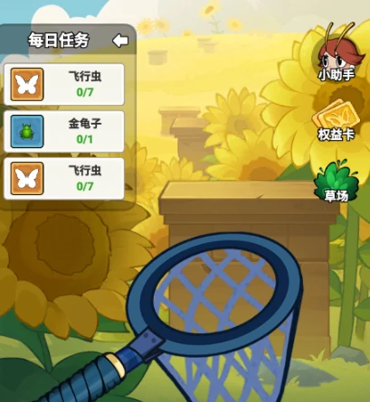 要是打累了,就切换成养生模式,拿起捕虫网去田园草场抓虫子。游戏里的虫子按体型和种类划分稀有度,稀有度越高,能给战力加的buff就越强。每天要攒够诱饵,去草场碰碰运气,说不定能捉到传说级稀有虫子。这里有不少抓捕目标,比如飞行虫、金龟子,每天完成抓捕任务还能解锁额外奖励。另外别忘了每日任务,游戏小助手会提醒当天的任务目标。