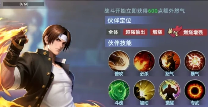 草薙京是强攻类的输出核心,堪称群攻天花板。在团战中,他能有效打破场面僵持的局面,其针对敌方全体的技能可造成高额伤害,一波就能把对手整体血线压下去。更关键的是他技能附带的燃烧效果,一旦挂到敌人身上,后续每回合都会持续掉血,慢慢消耗敌方血量与战斗力,为后续的收割环节创造绝佳条件。不管是推图还是竞技,这种持续的群体压制力都非常实用。