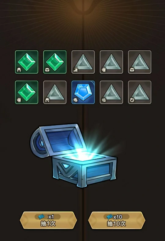 如果想要获取更多技能与宝石,玩家可以在商店界面通过技能召唤、宝箱抽取来实现。技能召唤会产出技能碎片,用于技能的升级进阶;宝箱则能开出不同品质的宝石,用不到的宝石还可以进行合成,这也是玩家中后期获取优质宝石的主要渠道。