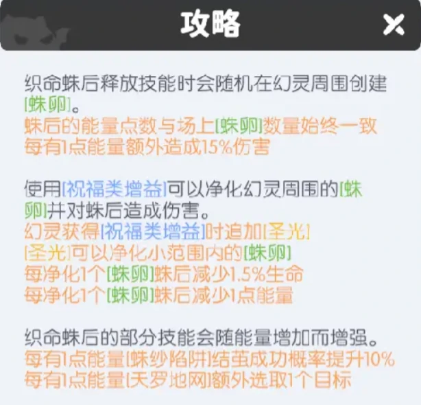 面对不同BOSS时,阵容要灵活调整,摸透BOSS技能机制后,用针对性阵营能快速击溃对手。比如蛛后的技能会生成蛛卵,持续给自身提供增益或给玩家施加减益,这时就需要带祝福类增益的角色来净化蛛卵,缩短负面效果的持续时间。前期关卡不用这么麻烦,用常规阵容就能顺利过渡,等后期难度陡增时,针对性应对BOSS机制才是提升攻击效率的关键。