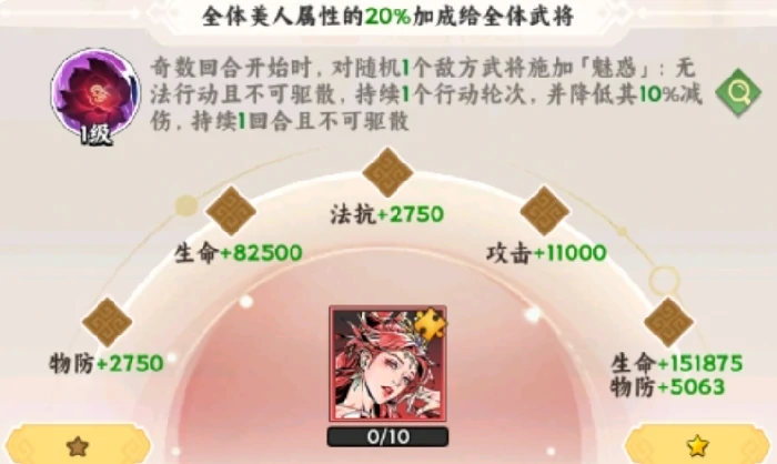 完成美人的收集与培养后,可激活全体美人的属性加成效果——为所有上阵武将提供20%的全属性提升。除基础属性外,每位美人都拥有独一无二的专属技能:貂蝉的倾城之惑,能让敌方单个单位陷入魅惑状态,使其持续无法行动,同时额外降低目标10%的减伤效果,且该负面状态无法被驱散。