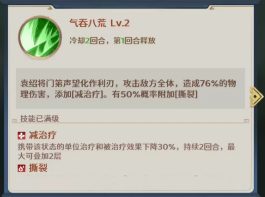 袁绍的核心玩法围绕减疗和撕裂debuff展开。他的主动技气吞八荒能给目标挂上减疗效果,让敌方单位的治疗效果降低30%;这个效果最多可叠加两层,最高减疗率可达62%。同时该技能还附带撕裂状态,每层撕裂会让目标每回合损失20%最大生命值,持续2回合,最多能叠5层。这套组合机制让他在对抗依赖续航、频繁回血的阵容时压制力拉满,尤其是在PVP对局里,能有效限制敌方治疗型角色的发挥空间。