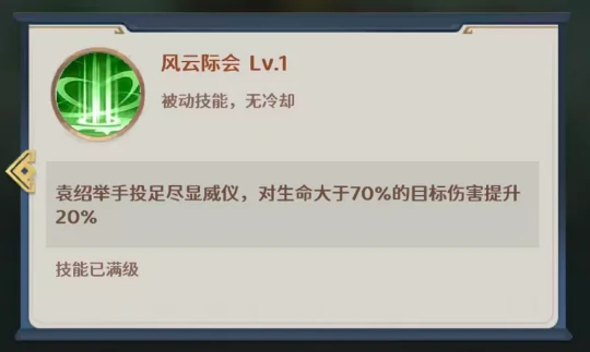 第三技能风云际会是无冷却被动技,当目标当前生命值高于70%时,能给袁绍额外提升20%伤害。该技能没有后续升级空间,但搭配气吞八荒的全体打击和持续减疗效果,能显著放大战术协同作用。除此之外,风云际会还有50%的概率附加撕裂状态,每层撕裂都能基于袁绍的攻击力产生额外间接伤害,对自带自损机制或者持续掉血特性的敌人也有不错的克制效果。