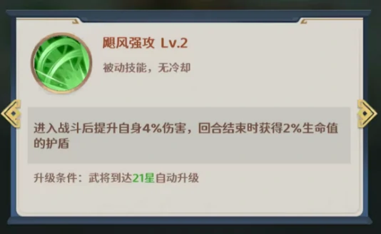 被动技飓风强攻能在战斗中自动触发14%的伤害加成,而且在他行动回合结束后,会将自身2%最大生命值转化为护盾。这个护盾在武将升至21星后能提升到更高百分比,21星之前只具备基础的格挡防护价值。另外,在双重能力共享的2回合周期内,袁绍可以通过高频释放减疗技能,实现多层debuff覆盖,进一步提升对敌方治疗体系的干扰效率。