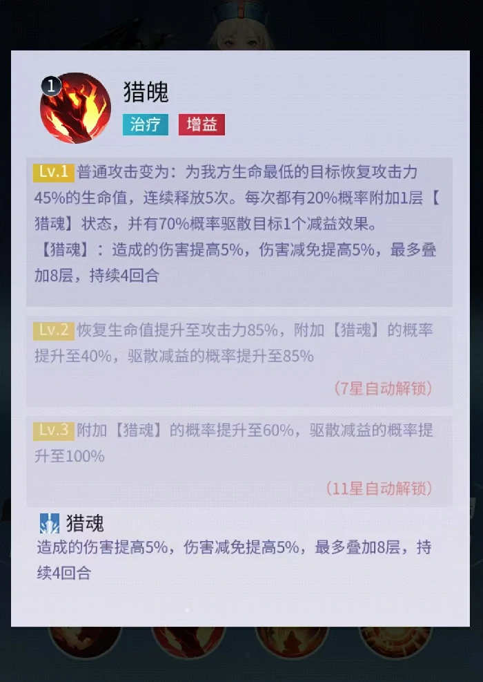 二技能重塑了普攻的作用逻辑:每次普通攻击都会转化为对当前生命值最低的友方单位进行单体治疗,这个效果会连续触发5次;每次治疗都有概率附加裂魂状态,还有独立的几率清除目标身上的减益效果。裂魂是可以叠加的增益状态,每叠加一层就能提升伤害输出和所受伤害的减免幅度,最高可以叠加到8层。这就意味着,在常规的战斗节奏下,将臣不仅能稳定抬升队友血量,还能通过高频的普攻实现治疗、驱散、增伤、减伤这四个功能的一体化,形成一套韧性极强的辅助闭环。