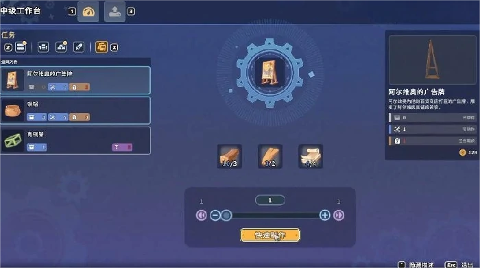 广告制作必须在中级工作台完成,所需基础材料固定为:木头×1、模板×1、草稿纸×1,三者缺一不可,且无需额外升级或特殊配方。建议日常采集资源时同步囤积这三类物资,避免临时短缺拖慢任务进度。