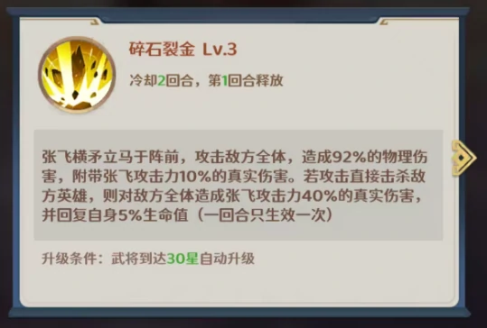 一技能碎石炼金是张飞的核心输出技能。该技能能对敌方全体造成等同于自身92%物攻的伤害,还会额外附加自身攻击力10%的真实伤害。要是这次攻击直接击杀了任意敌方单位,就会以该目标位置为中心,额外触发一次相当于自身40%攻击力的真实伤害。这种连击机制让他在收割残血单位时拥有极高的战术价值。与此同时,每成功击杀一个目标,张飞就能回复自身5%的最大生命值,不过这个效果每回合只能触发一次——单次恢复的数值看似不高,但配合高频的行动节奏,能持续缓解阵容的治疗压力,大幅降低队伍对辅助武将的依赖度。