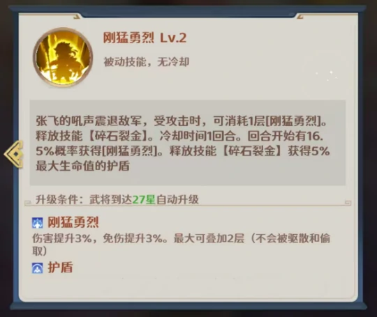刚猛勇烈状态还和张飞的被动机制深度联动:当张飞遭到敌方攻击时,会消耗一层刚猛勇烈状态,自动释放一次碎石炼金;另外每回合开始时,还有约16%的概率直接获得一层刚猛勇烈状态。这让张飞在战斗中后期能频繁触发追加行动,大幅提升技能的释放频率和实战中的容错率。再加上5%的生命护盾效果,张飞在前排的生存稳定性进一步增强,真正实现了“站得住、输出足、回复稳”的战斗表现。