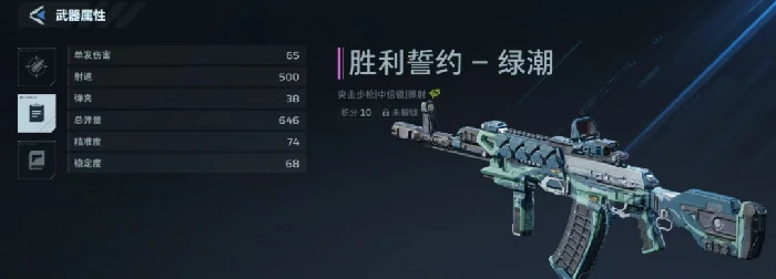 胜利誓约·绿潮在属性上完全继承原武器性能:基础单发伤害65点,理论射速500发/分钟,标准弹匣容量38发,总携弹量646发,精准度数值74,稳定度68。这套参数组合明确了其均衡型突击步枪的定位,中远距离交火时能提供可靠压制能力;同时支持中倍率光学瞄具切换,进一步提升战术瞄准效率。整枪采用重工业机械美学设计,整体轮廓延续飓风系列标志性结构,厚重感与功能性兼具。
