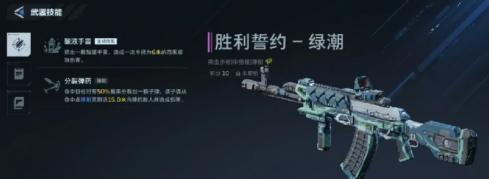 技能配置方面,主动技“酸液手雷”可投掷一枚区域型腐蚀装置,命中后会在半径6米范围内持续施加伤害;被动技“分裂弹药”则让子弹拥有50%概率触发二次弹道——分裂出的子弹会在15米内自动追踪并命中其他敌方单位,形成链式打击效果。双技能协同能显著提升清场效率,尤其适配敌人密度较高的场景。