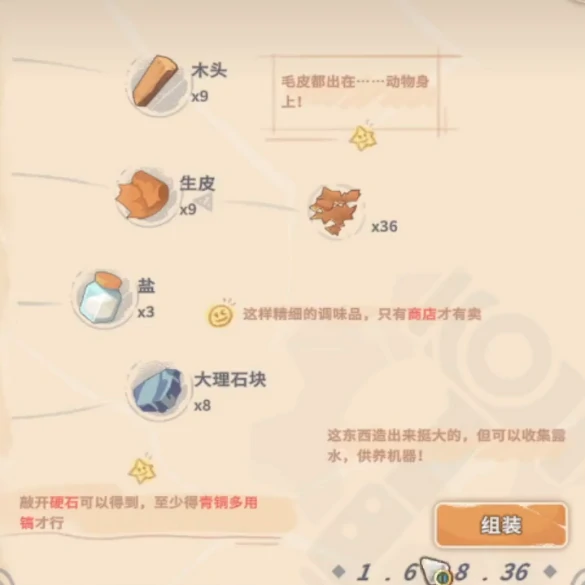 单台露水收集器的标准制作配方为:3根木棒、3张简单皮革、2块大理石砖、2个石槽。其中木棒可由基础木料合成,每根消耗3单位木头,算下来总共需要9单位木头;前期砍伐枯杨树或清理林地废墟就能快速积累,资源获取门槛较低。