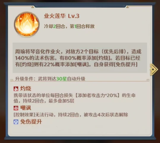 一技能「业火莲华」是开局就能触发的核心技能,会在首回合自动释放。它能将琴音转化为炽热业火,精准锁定敌方后排两名目标,造成相当于自身140%基础法术攻击的伤害。命中目标时有80%的概率为其施加1层灼烧效果;要是目标已经带有灼烧状态,还能额外以22%的概率附加1层嘲讽,同时周瑜自身会获得1层免伤增益。当武将升至30星后,这个技能会自动获得强化:灼烧状态会让目标每回合损失相当于周瑜20%攻击力的生命值,该效果最多可叠加5层,持续伤害会随层数叠加呈现指数级攀升。而嘲讽属于强控机制,被嘲讽的单位无法自主行动,直到承受4次攻击后才会解除控制,这对敌方前排肉盾角色有着极强的反制作用。