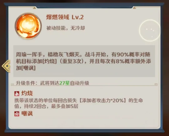 终极被动「爆燃领域」会在战斗开始瞬间激活,能以90%的高概率对随机敌方目标施加灼烧效果,而且这个触发最多可以重复3次,大幅提升给敌方群体挂灼烧的效率。每成功施加一次灼烧,还有8%的概率额外附加1层嘲讽效果。通过多重状态叠加与技能之间的联动,周瑜能在战斗中后期形成稳定的「灼烧→嘲讽→暴击→再灼烧」正向循环。