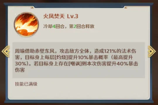 二主动技能「火凤焚天」是冷却时间为四回合的大范围法术技能,最早能在第二回合释放。它能对全体敌方目标造成121%的法术伤害,同时会根据目标身上的嘲讽层数提供暴击率加成:每1层嘲讽提升10%暴击率,最高可叠加3层(也就是30%暴击率);如果目标已经处于嘲讽状态,还会直接获得40%的暴击率提升。这个机制让它成为周瑜暴击流体系里的核心爆发技能,特别适合搭配能维持高嘲讽覆盖率的阵容。