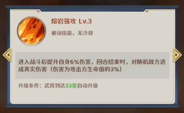 被动技能「熔岩强攻」没有冷却限制,每回合都会稳定生效。进入战斗后,周瑜会立刻获得6%的全伤害提升效果;每回合结束时,还会对随机一名敌方目标造成真实伤害,数值为自身当前生命值的3%。武将达到33星后,该被动会解锁强化效果,真实伤害的比例会进一步提高,确保周瑜在持久战里也能稳定保持可观的额外输出节奏。
