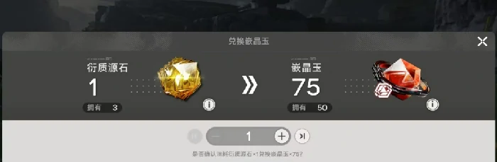 衍质源石兑换是最即时的获取方式:当前稳定兑换比例为1:75,也就是消耗1个衍质源石可获得75枚嵌晶玉。该兑换路径没有次数限制,但要注意衍质源石本身产自高难度关卡与稀有事件,建议优先保障关键干员的抽取需求后,再考虑用衍质源石兑换嵌晶玉。