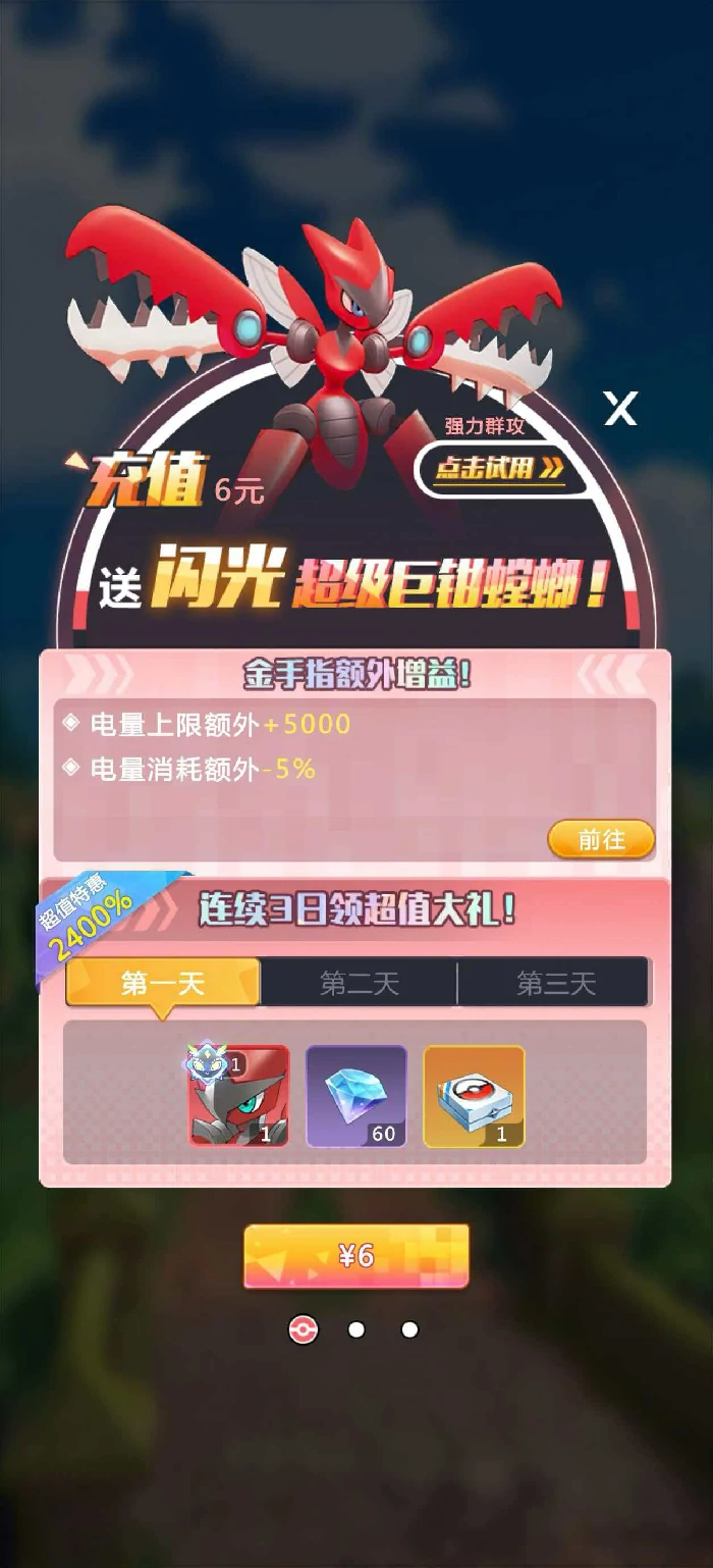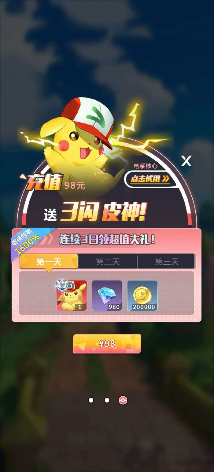 首充是前期性价比拉满的投入选择:入手98元档位,就能直接拿到限定的戴帽款闪光皮卡丘,还能同时解锁钻石、金币以及百变怪等养成资源,综合回报率大概有16倍,能明显加快核心战力的成型速度。