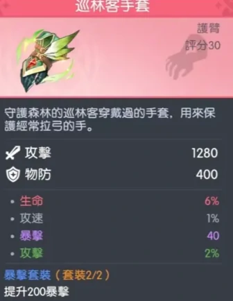 巡林客手套乍一看是偏向物理职业的装备,但搭配在洛基身上效果却出奇的好。1280点攻击属性进一步夯实输出基础,400点物理防御能有效弥补法师身板脆弱的短板,6%生命加成可快速提升血量上限,避免被敌方刺客一套秒杀。1%攻击速度看似不起眼,却能优化普攻衔接技能的手感,让输出节奏更顺滑。最核心的是套装暴击效果,两件套可提供200点暴击属性,叠加暴击加成后输出优势拉满。