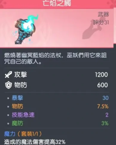 亡焰之触是洛基的法师毕业级核心装备,能提供1200点高额攻击加成,同时附带3%魔法防御与7.5%物理防御,让他在面对物理、魔法伤害时拥有基础的生存底气。30点暴击属性正好契合他的输出机制,能快速提升暴击率,让灼烧、诅咒这类debuff的触发收益更上一层楼。套装自带的32%魔法伤害提升效果,相当于给洛基的所有技能都加上了常驻增伤buff。