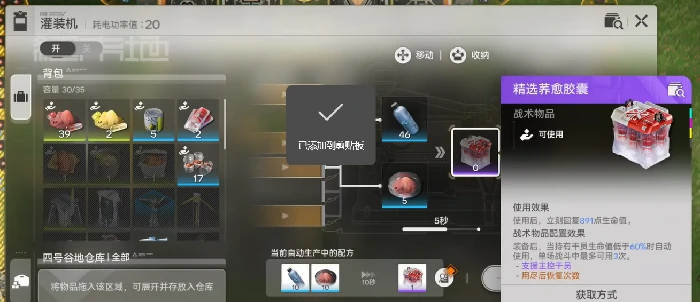 首先得重点关注两类核心物资——乔郁胶囊与电池。这两类物资不仅在交易市场价值不菲,更是营地日常运转的刚需。乔郁胶囊分普通、中级、高级三个档次,电池也对应有小、中、大三种规格。开局阶段优先搭建这两条产线会更稳妥,否则后续营地运转很容易陷入被动。乔郁胶囊的产线直接沿用系统自带的蓝图即可,单条产线的产能就足够支撑到银币科技升至二级。生产出的中级胶囊,既可以用于营地内的物资兑换,也能给干员提供属性加成。
