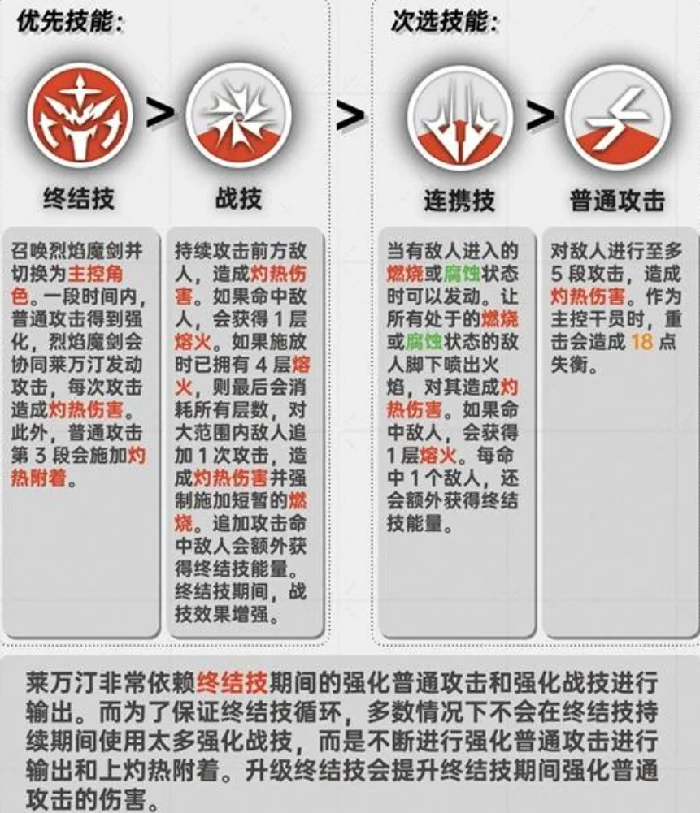 培养莱万汀的第一步,得先摸透他的核心机制。他以灼热伤害为基础,战斗全程围绕熔火层数运转:通过重击可以吸收敌人身上的灼热附着层数,消耗这些层数释放战斗技能时,能额外解锁伤害加成。同时,他的战斗技能和连携技能可以加速终结技的回能速度,而终结技正是他的爆发核心——开启后不仅会强化普攻,还能触发大范围的斩杀效果,清场能力拉满。