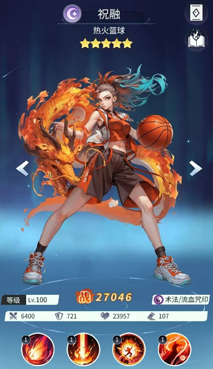 祝融的一技能八荒圣炎是核心输出手段,可对敌方中后排目标造成高额魔法伤害,还附带两种不可驱散的持续伤害异常状态:流血(每回合造成固定数值真实伤害,最高可叠加5层)与疫病(让目标在连续两个行动回合内额外承伤)。两种状态叠加后能带来极强的压制力与斩杀可能,且技能等级越高,异常状态触发概率就越高;此外升级后还会随机给一名敌方后排附加血炎效果,若目标是法师或战士职业,那他被流血、疫病状态击杀的概率将直接拉满至100%,形成一套高稳定性的终结连招。