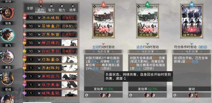 张飞的技能组合建议选决水破敌和缮甲厉兵。前者会给敌方施加洪水状态,随着层数累积逐步降低敌方行动速度,还能让我方获得先手权;后者则在承受伤害后强化自身抗性和反击能力,配合追击机制打出不错的群体伤害。这套配置既保证了前排的生存韧性,又能为黄忠创造更长的安全输出时间,让队伍在面对慢热型或者依赖控制的阵容时拥有压倒性优势。