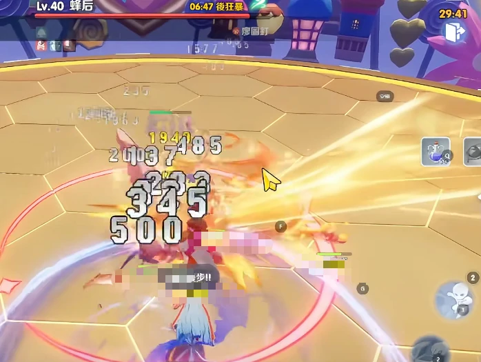 当蜂后血量低于25%时,就会进入终末狂暴阶段。这时候它会高频释放两种范围AOE:一种是黄色环状爆炸区域,半径覆盖屏幕三分之二,看到预警后必须在2秒内撤到圈外;另一种是高速旋转扩散的爱心阵列,攻击频率变高还带减速效果。这两类技能结束后,BOSS都会进入固定4秒左右的虚弱状态,期间它防御力下降50%,还没法用任何主动技能,这是完成终结斩杀的唯一机会。